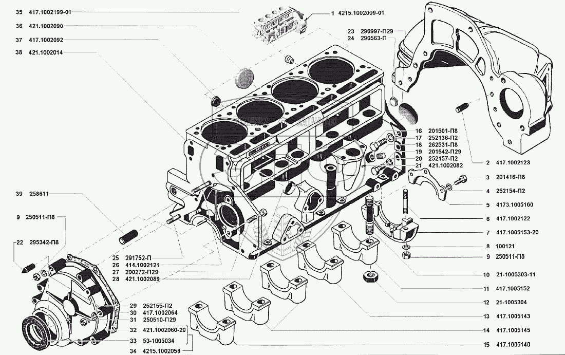 | 1 | 4215.1002009-01 | Блок цилиндров с крышками и картером сцепления в сборе | Нет на складе | |