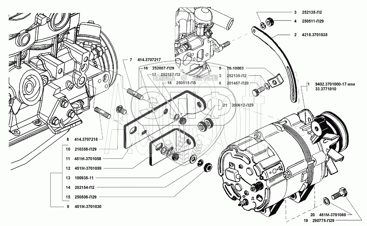 | 9 | 451М-3701030 | Кронштейн крепления генератора в сборе | Нет на складе | |