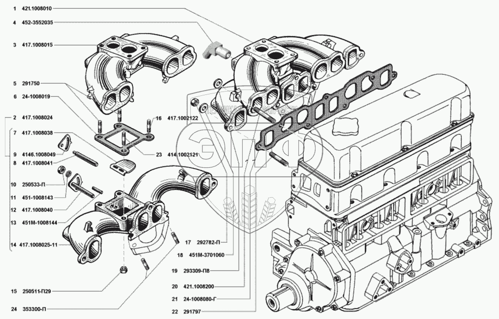 Каталог запасных частей к технике: УМЗ-421. Газопроводы впускной и выпускной