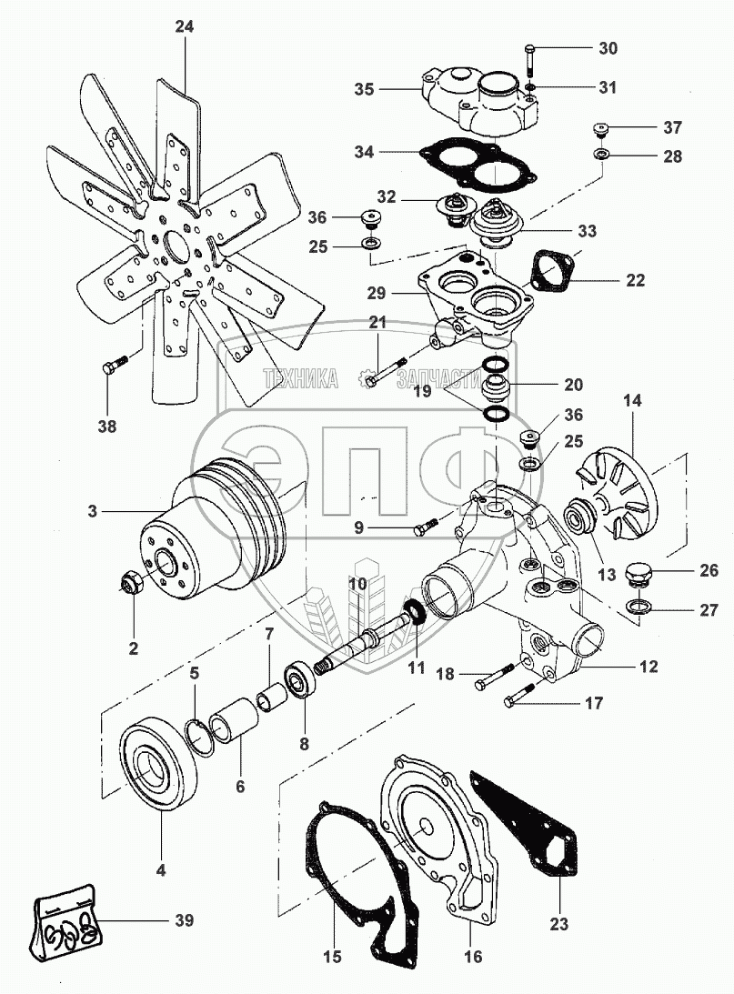 Каталог запасных частей к технике: Valmet 634 DSBIL. WATER PUMP, THERMOSTAT AND HEAT EXCHANGER