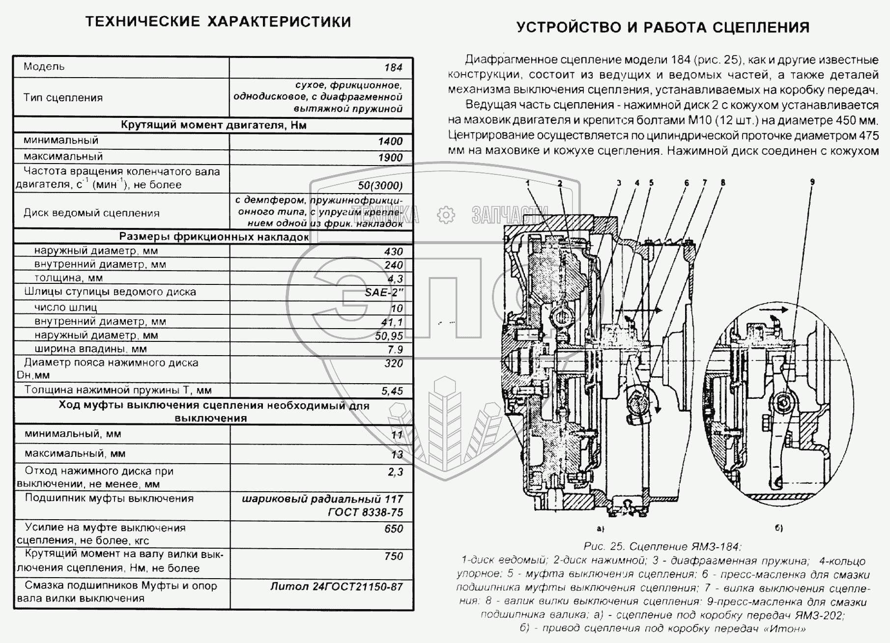 Каталог запасных частей к технике: ЯМЗ-7511. Технические характеристики. Устройства и работа сцепления