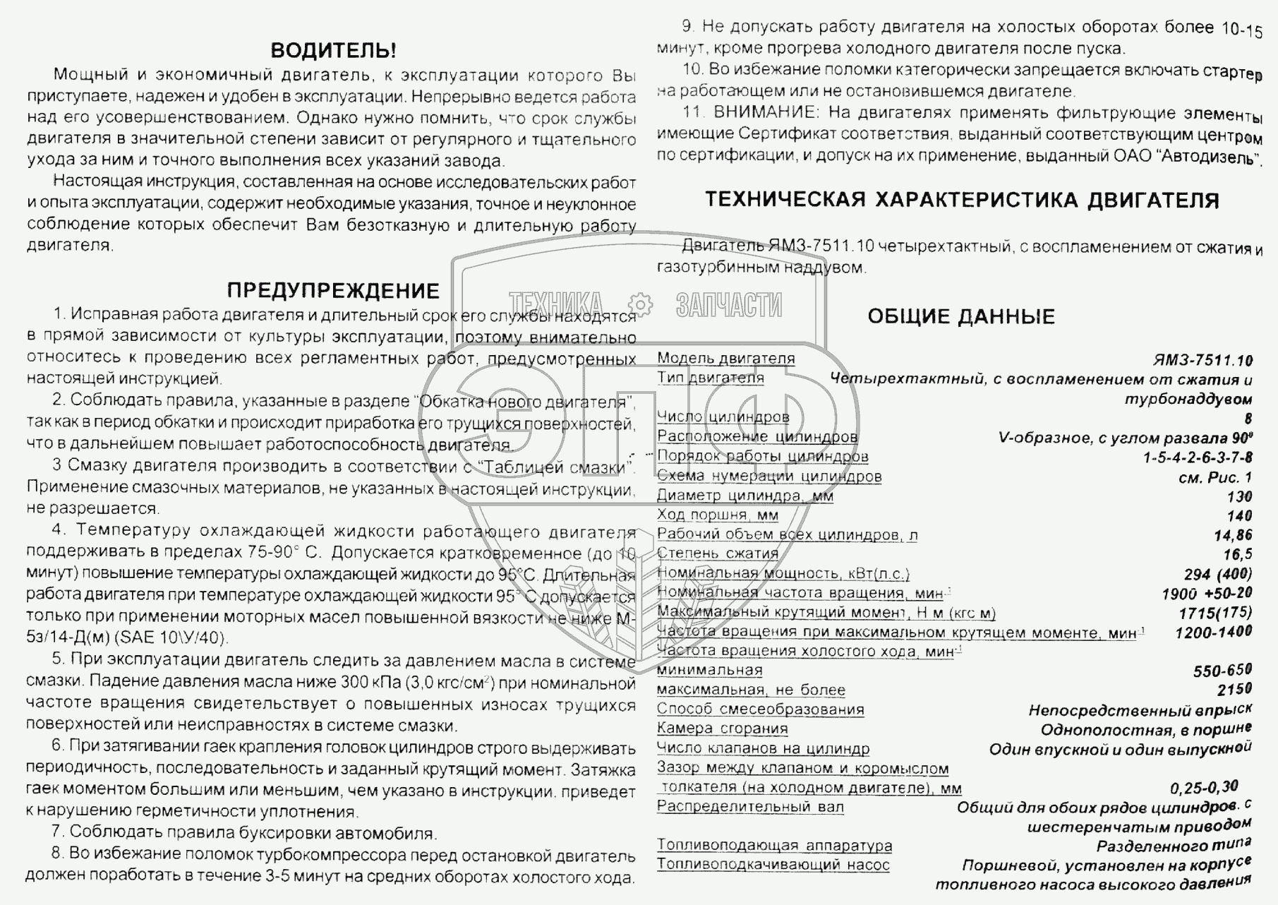 Каталог запасных частей к технике: ЯМЗ-7511. Водитель! Предупреждение. Техническая характеристика, общие данные