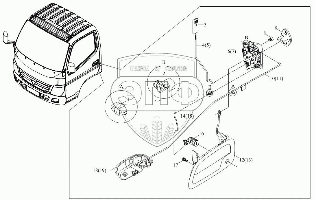 Каталог запасных частей к технике: Foton BJ1041, BJ1069 (Ollin). 1SB1806150107 Дверной замок