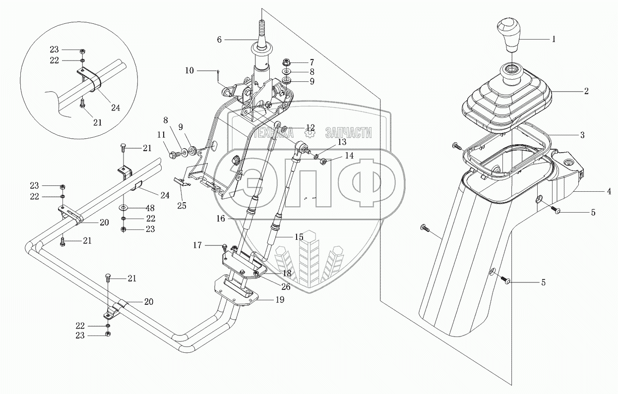 Каталог запасных частей к технике: Foton-BJ1039. Установка механизма управления переключением передач