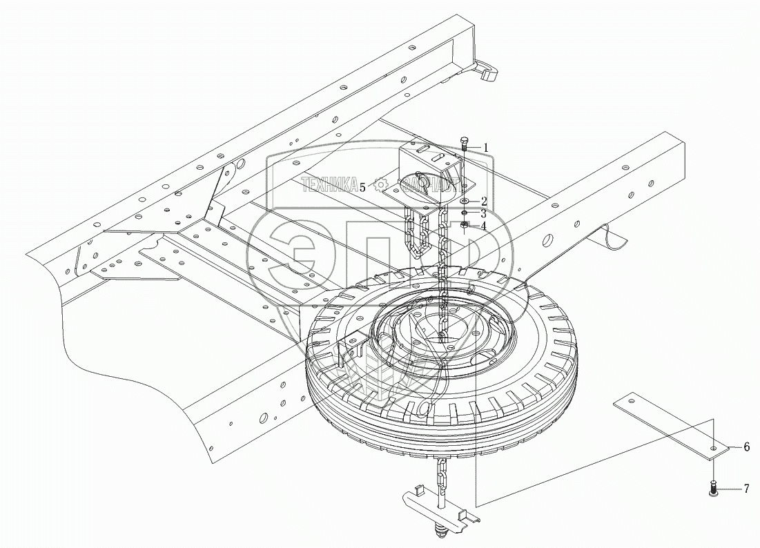 Каталог запасных частей к технике: Foton-BJ1039. Устройство подъемное запасного колеса