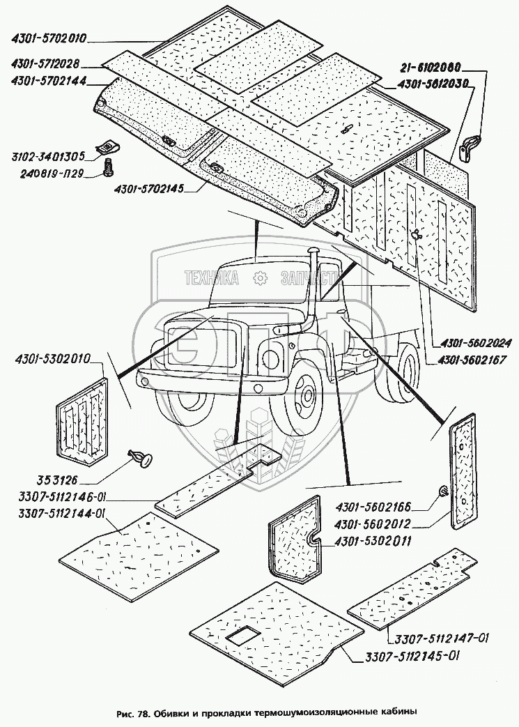 Каталог запасных частей к технике: ГАЗ-3306. Обивки и прокладки термошумоизоляционные кабины