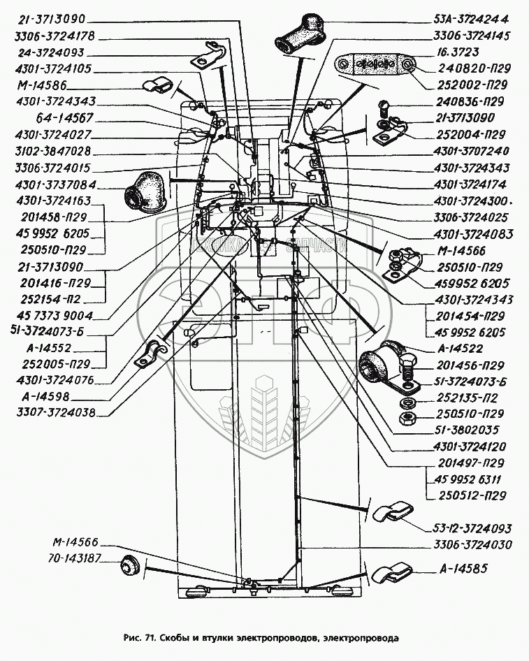 Каталог запасных частей к технике: ГАЗ-3306. Скобы и втулки электропроводов, электропровода