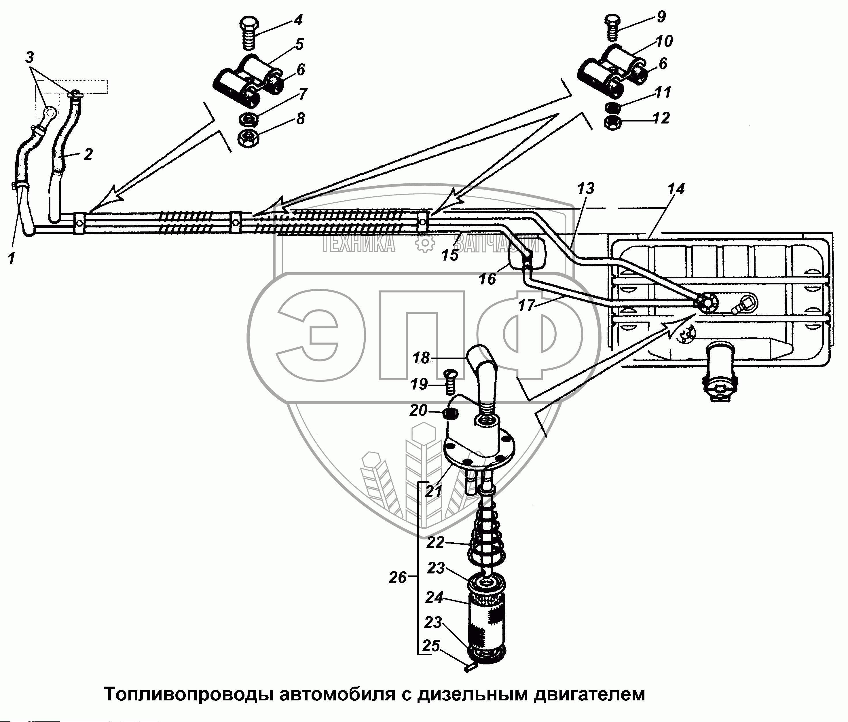 Каталог запасных частей к технике: ГАЗ-3308. Топливопроводы автомобиля с дизельным двигателем
