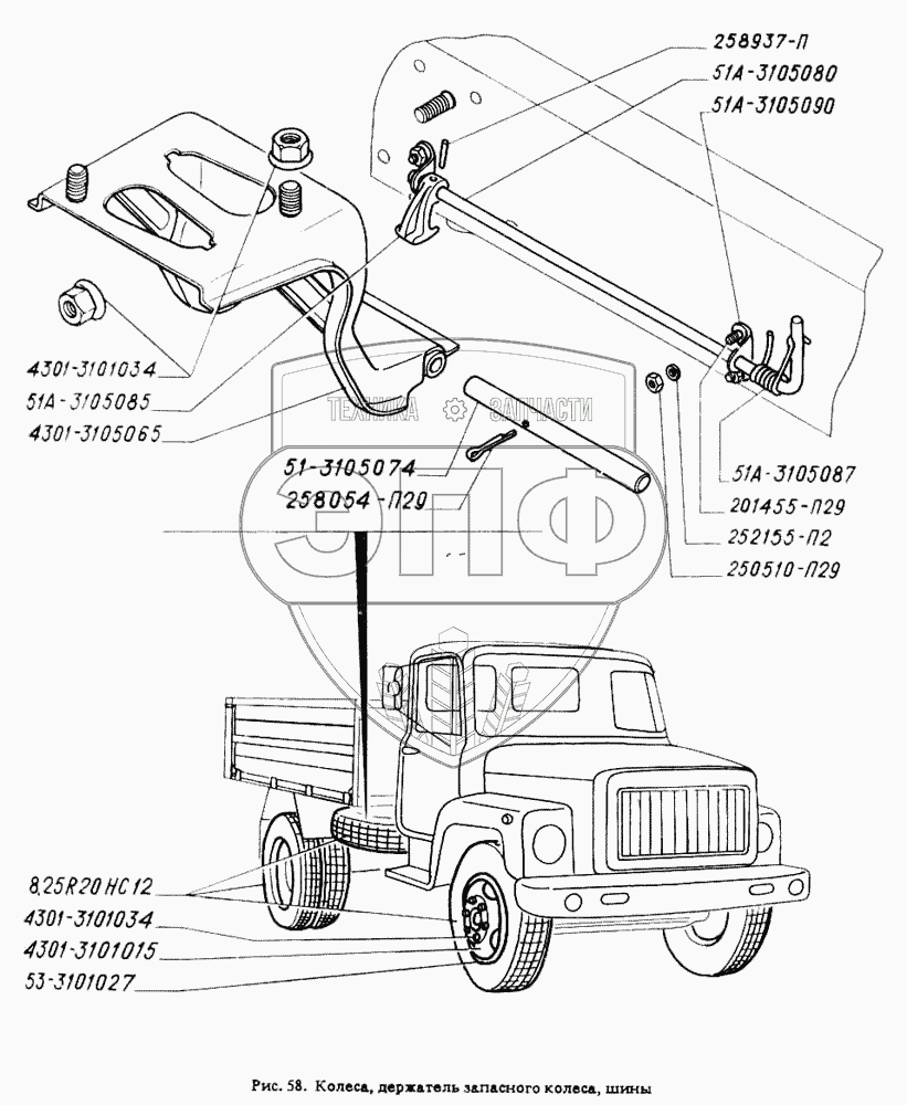 Каталог запасных частей к технике: ГАЗ-4301. Колеса, держатель запасного колеса, шины