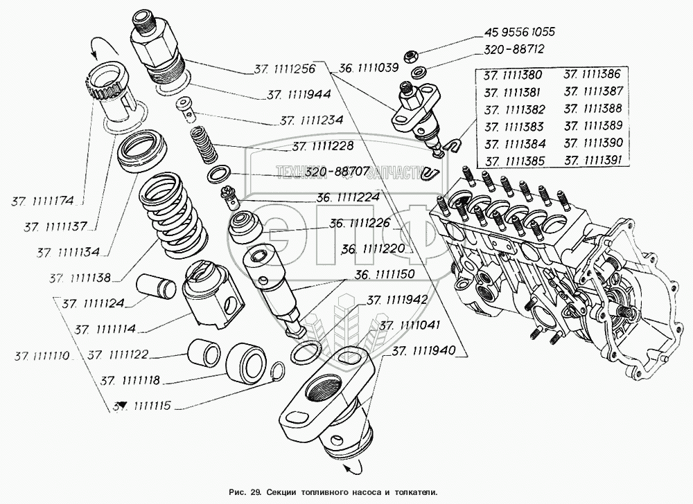 Каталог запасных частей к технике: ГАЗ-4301. Секции топливного насоса и толкатели
