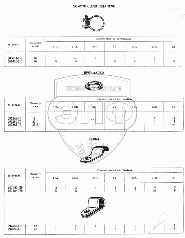 Каталог запасных частей к технике: ГАЗ-51 (63, 93). Хомутик, прокладка, скобы