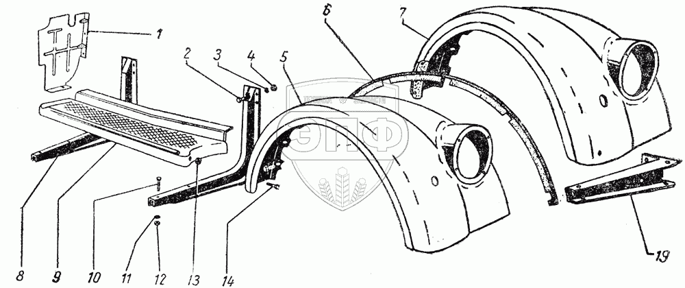 Каталог запасных частей к технике: ГАЗ-51 (63, 93). Переднее крыло, подножка