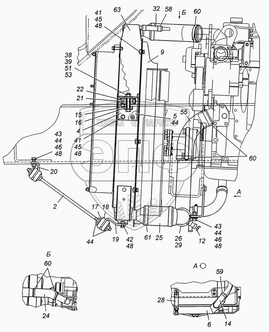 Каталог запасных частей к технике: Камский автозавод 4308. Установка радиатора Э4308-1300023