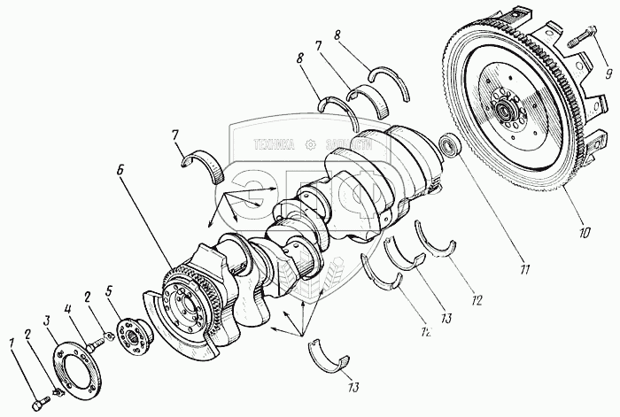 Каталог запасных частей к технике: Камский автозавод 43101. Установка вала коленчатого с маховиком
