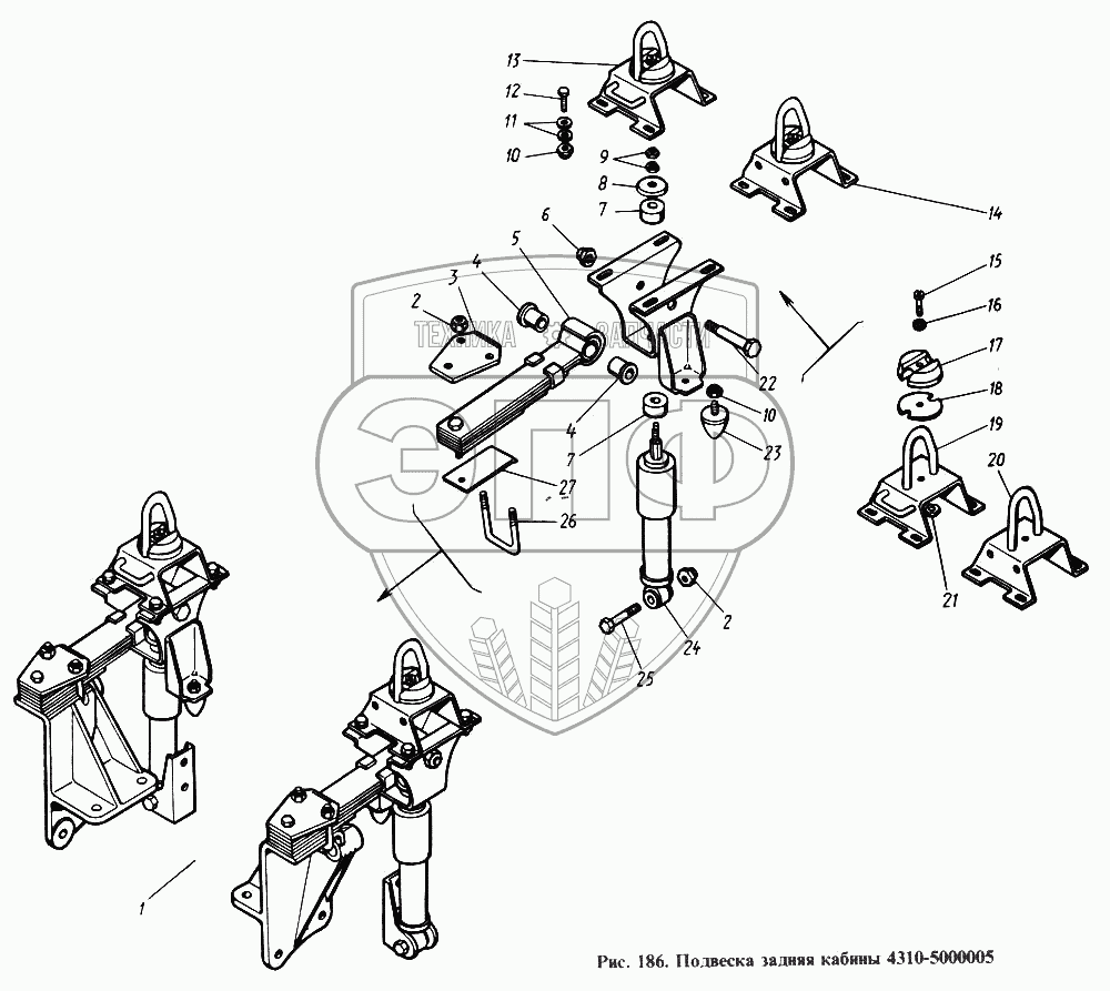 Каталог запасных частей к технике: Камский автозавод 4310. Подвеска задняя кабины
