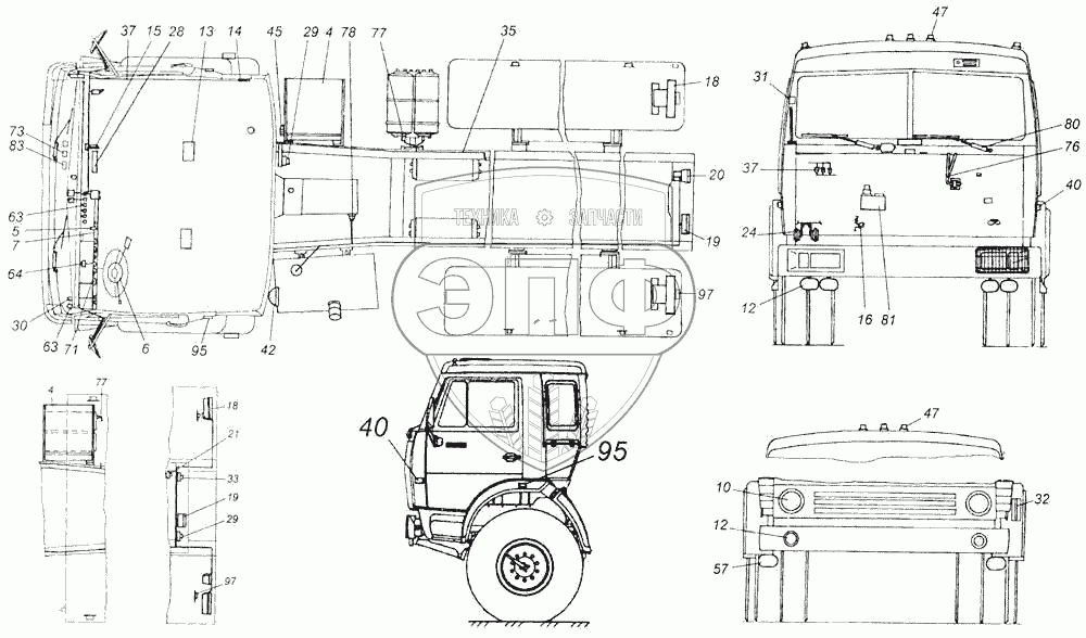 Каталог запасных частей к технике: Камский автозавод 43118. Электрооборудование. Расположение на автомобиле