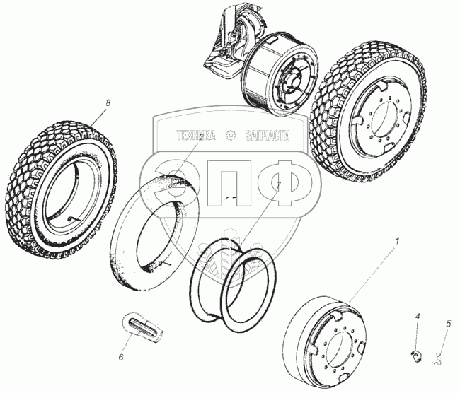 Каталог запасных частей к технике: Камский автозавод 43118. Колесо с шиной правое
