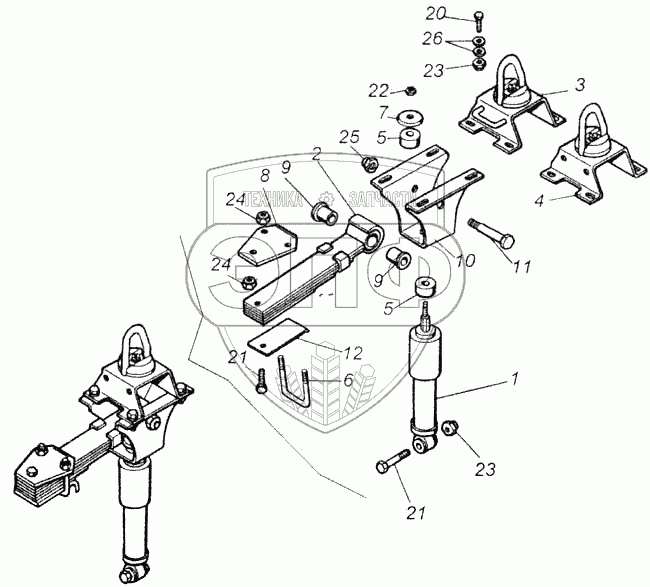 Каталог запасных частей к технике: Камский автозавод 4326. Установка задней подвески кабины