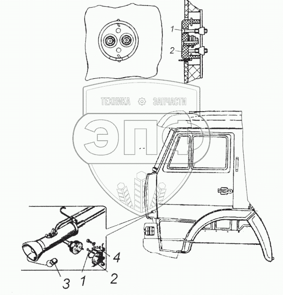 Каталог запасных частей к технике: Камский автозавод 53228, 65111. Установка розетки переносной лампы