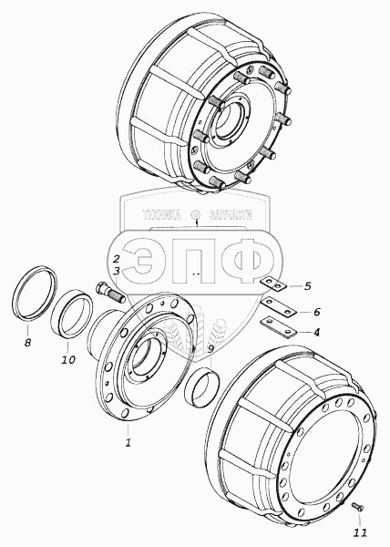 Каталог запасных частей к технике: Камский автозавод 5360. Ступица с тормозным барабаном