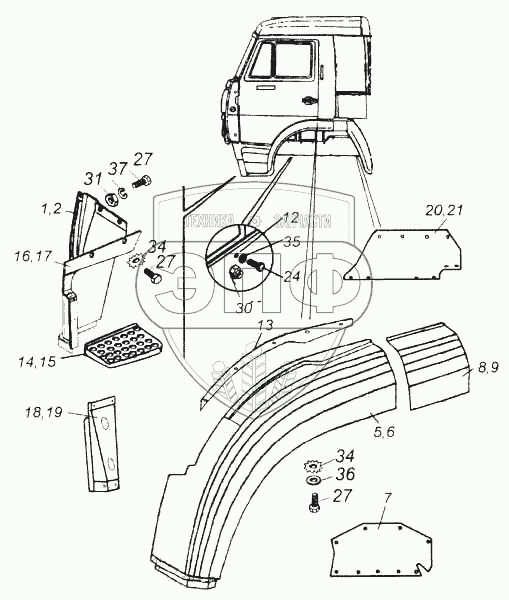 Каталог запасных частей к технике: Камский автозавод 5360. Установка оперения кабины