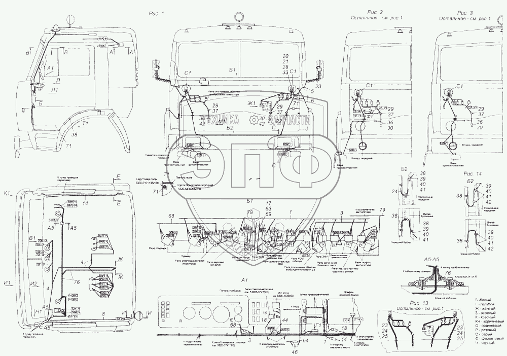 Каталог запасных частей к технике: Камский автозавод 5460. Установка проводов на кабине