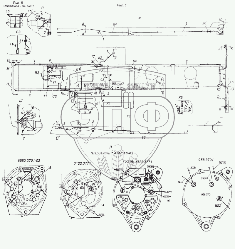 Каталог запасных частей к технике: Камский автозавод 5460. Установка проводов на шасси