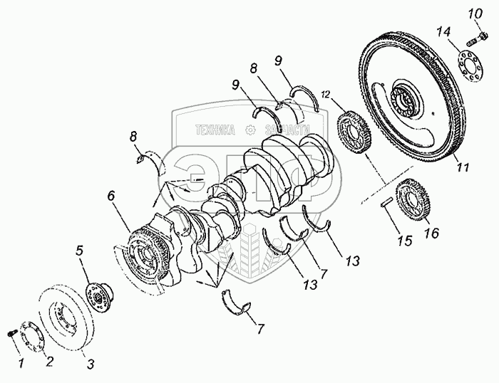 Каталог запасных частей к технике: Камский автозавод 6460. Установка коленчатого вала и маховика