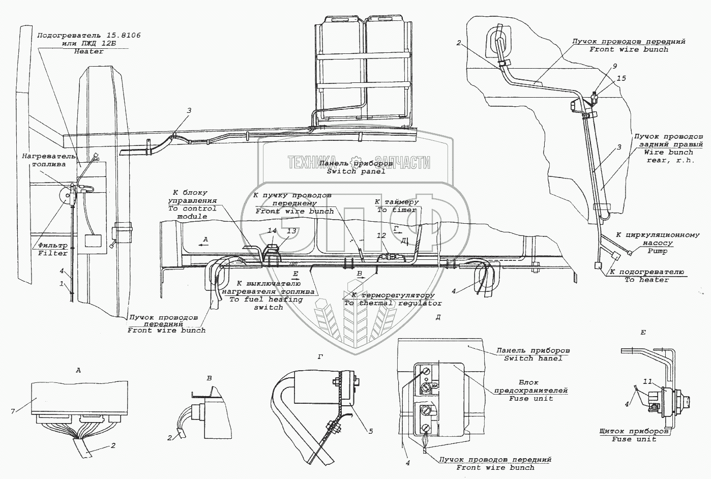 Каталог запасных частей к технике: Камский автозавод 65116. Установка электрооборудования подогревателя