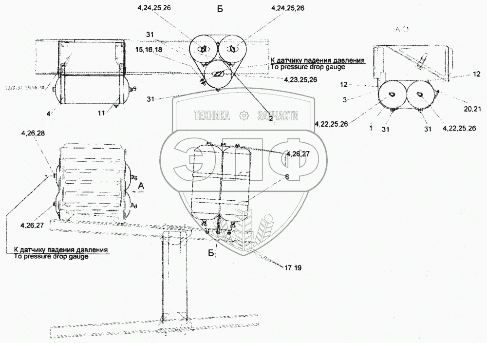 Каталог запасных частей к технике: Камский автозавод 6520. Установка воздушных ресиверов