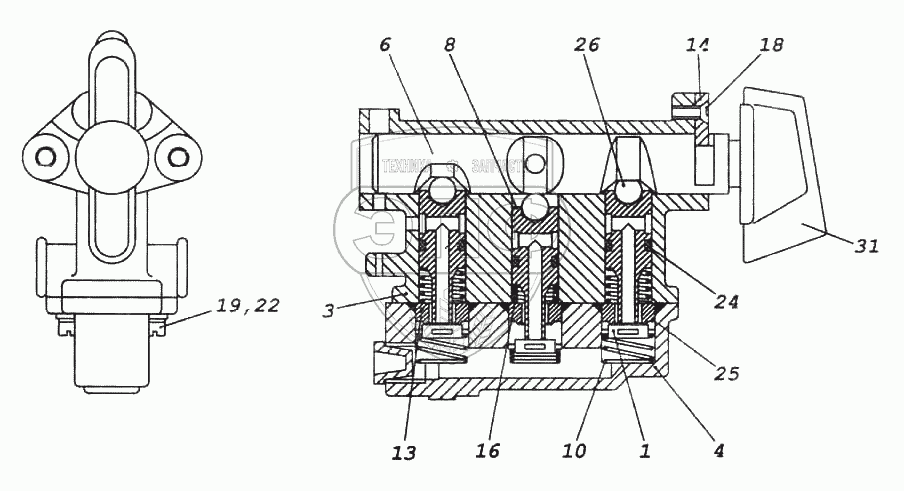 Каталог запасных частей к технике: Камский автозавод 6522. Кран управления раздаточной коробки