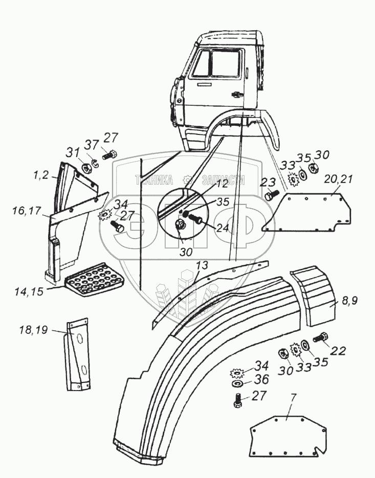 Каталог запасных частей к технике: Камский автозавод 6522. Установка оперения кабины
