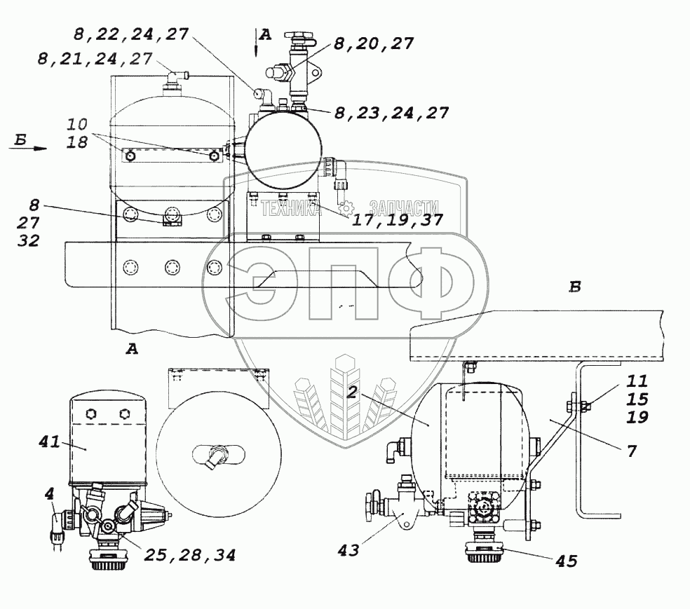 Каталог запасных частей к технике: Камский автозавод 6522. Установка осушителя