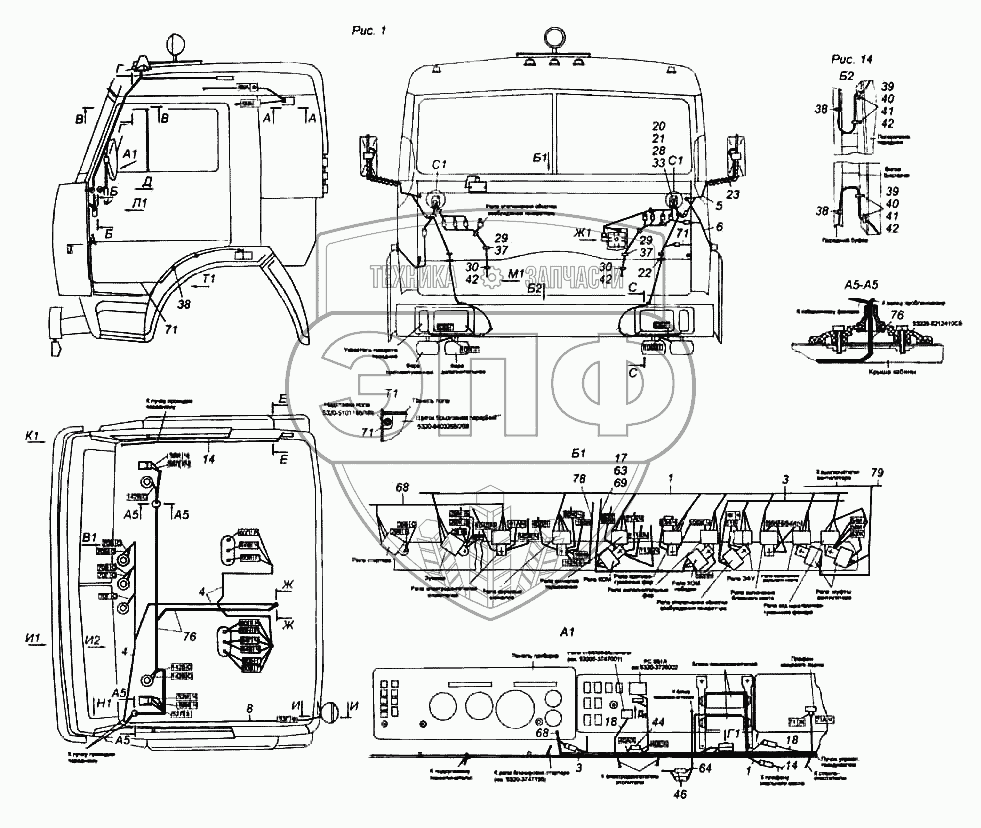 Каталог запасных частей к технике: Камский автозавод 6522. Установка проводов на кабине