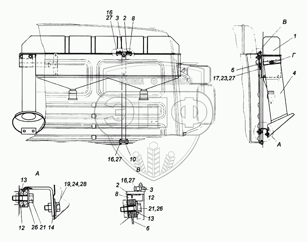 Каталог запасных частей к технике: Камский автозавод 6522. Установка воздухоочистителя мультициклонного