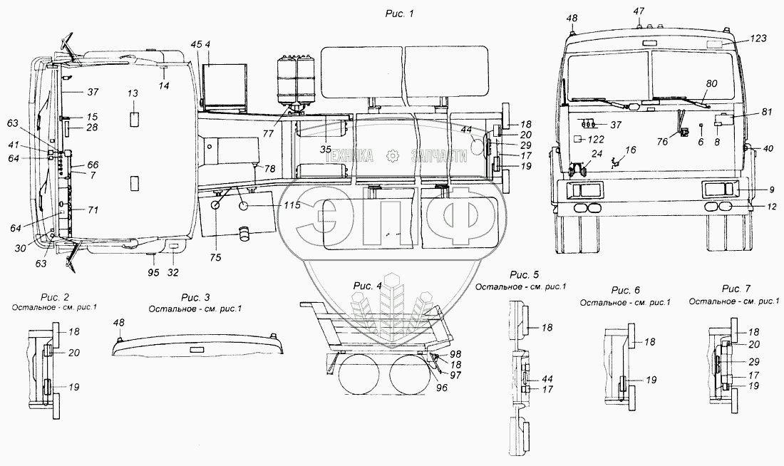 Каталог запасных частей к технике: Камский автозавод 6540. Электрооборудование. Расположение на автомобиле