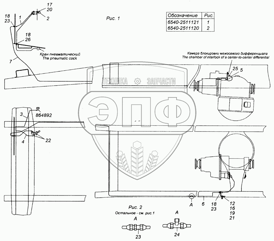 Каталог запасных частей к технике: Камский автозавод 6540. Привод блокировки межосевого дифференциала