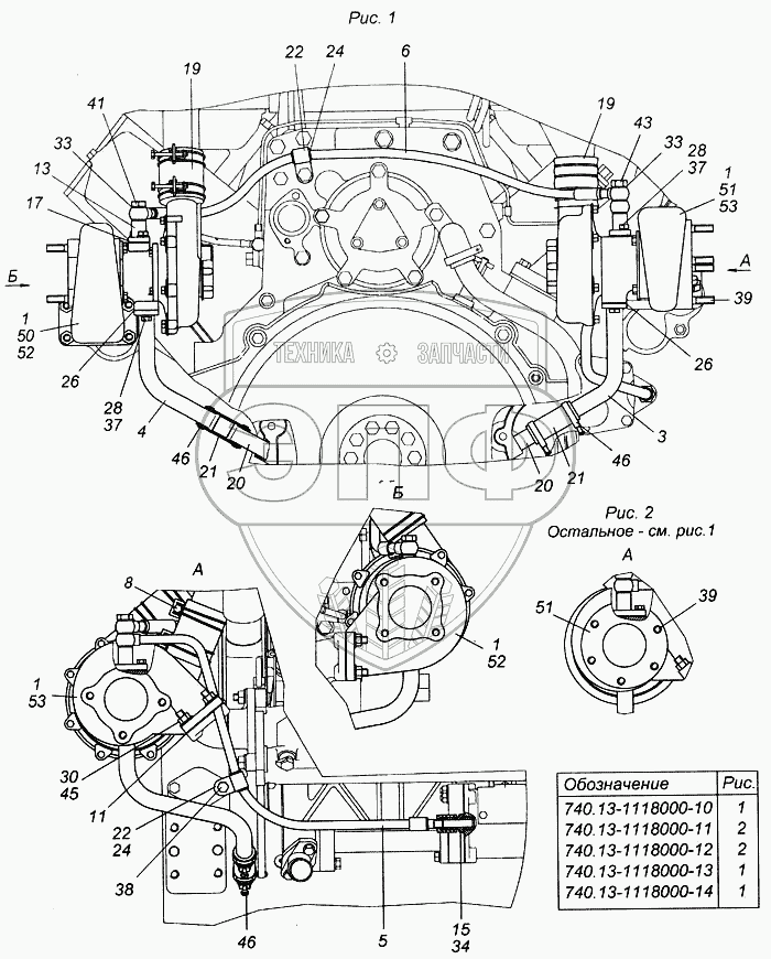 Каталог запасных частей к технике: Камский автозавод 6540. Установка турбокомпрессора на двигатель