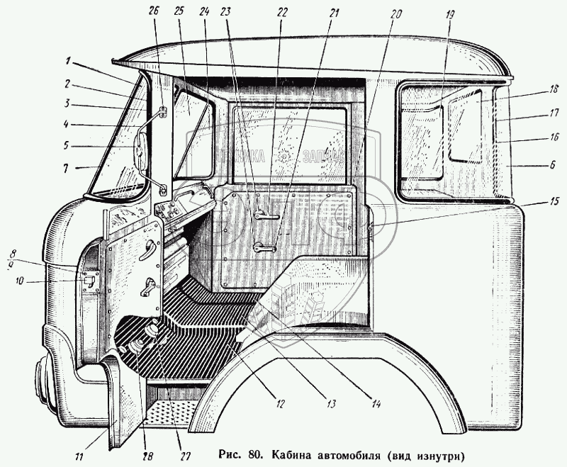 Каталог запасных частей к технике: КАЗ 608. Кабина автомобиля (вид изнутри)