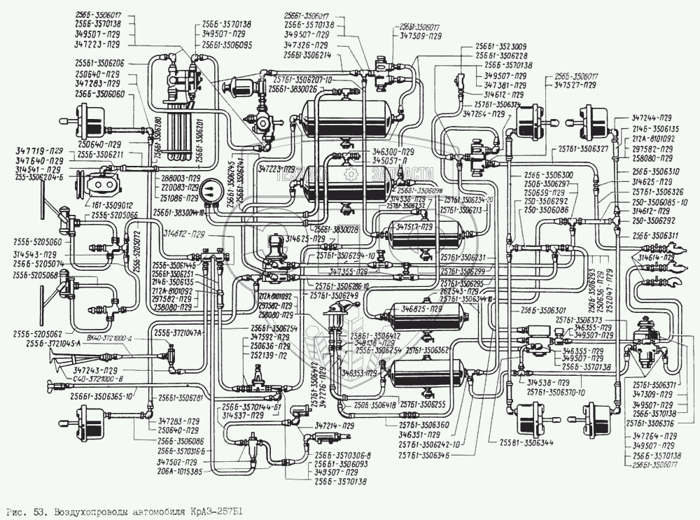 Каталог запасных частей к технике: КрАЗ-256. Воздухопроводы автомобиля КрАЗ-257Б1
