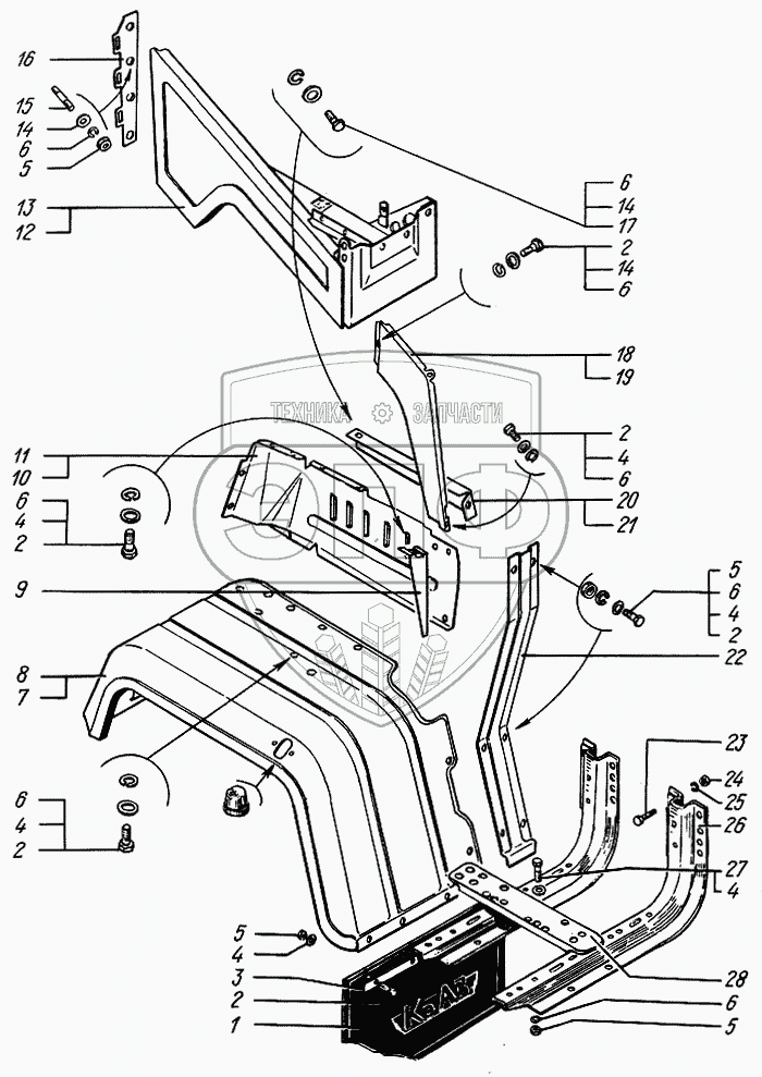 Каталог запасных частей к технике: КрАЗ-65055. Крыло переднее и подножки