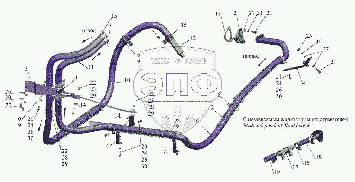 Каталог запасных частей к технике: МАЗ-437040 (Зубренок). Установка шлангов отопителя