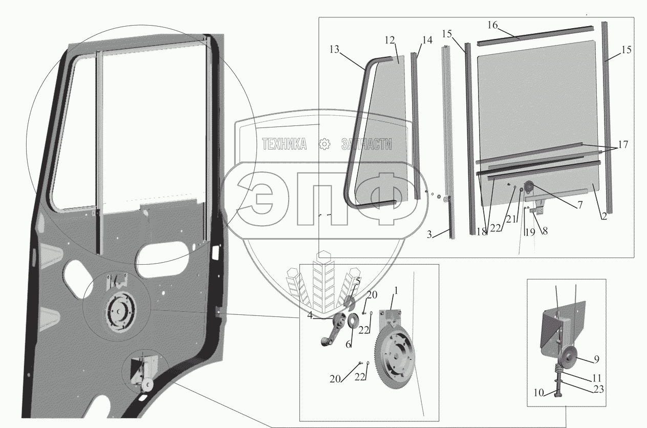 Каталог запасных частей к технике: МАЗ-437041 (Зубренок). Установка стеклоподъемника и ручки