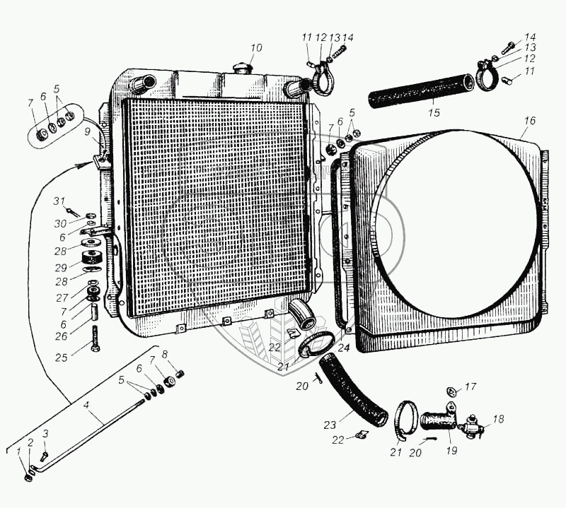 Каталог запасных частей к технике: МАЗ-5335. Радиатор и его крепление