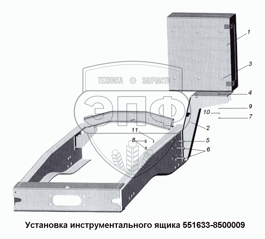 Каталог запасных частей к технике: МАЗ-533731. Установка инструментального ящика 551633-8500009