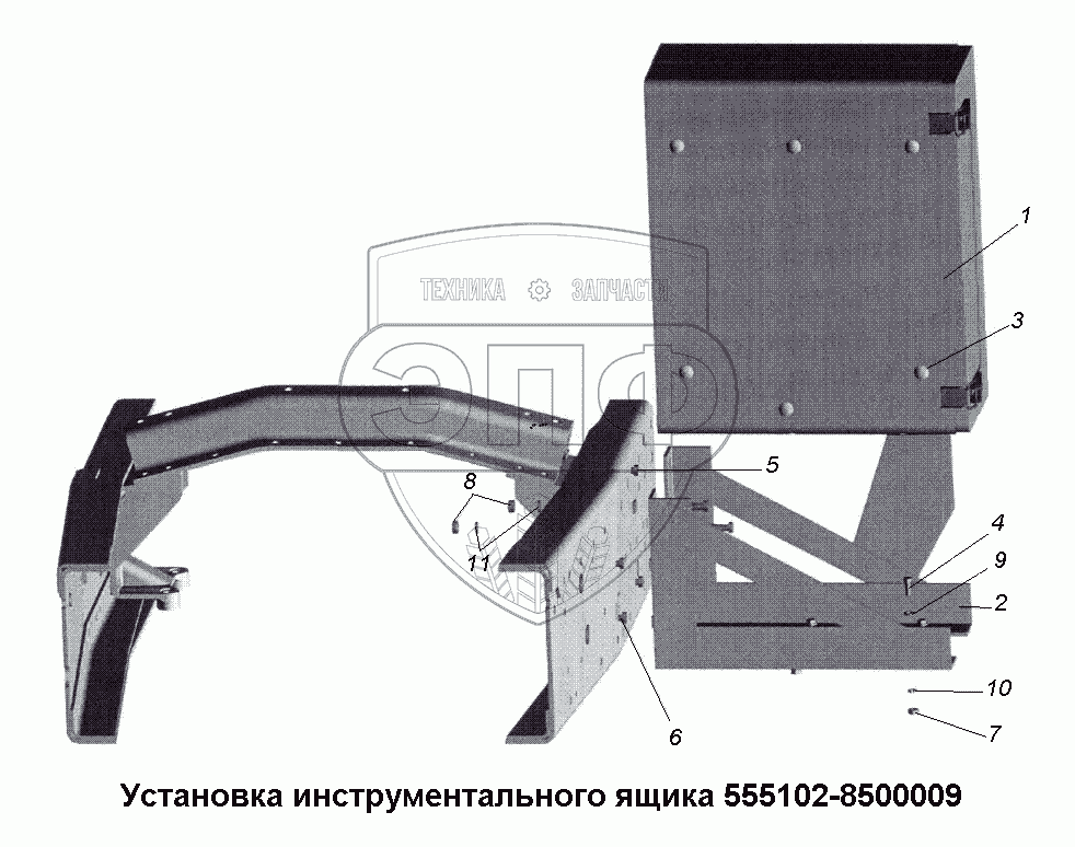 Каталог запасных частей к технике: МАЗ-533731. Установка инструментального ящика 555102-8500009