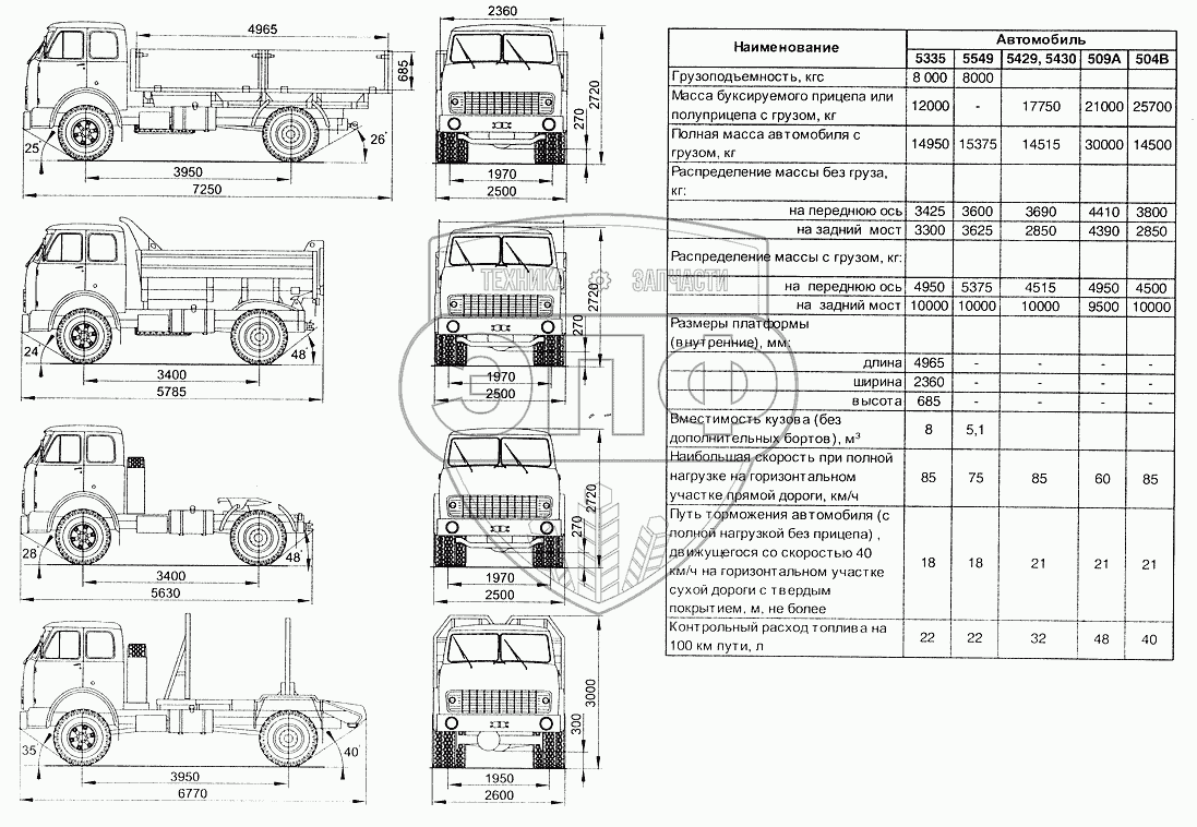 Каталог запасных частей к технике: МАЗ-5429. Габаритные размеры и технические данные