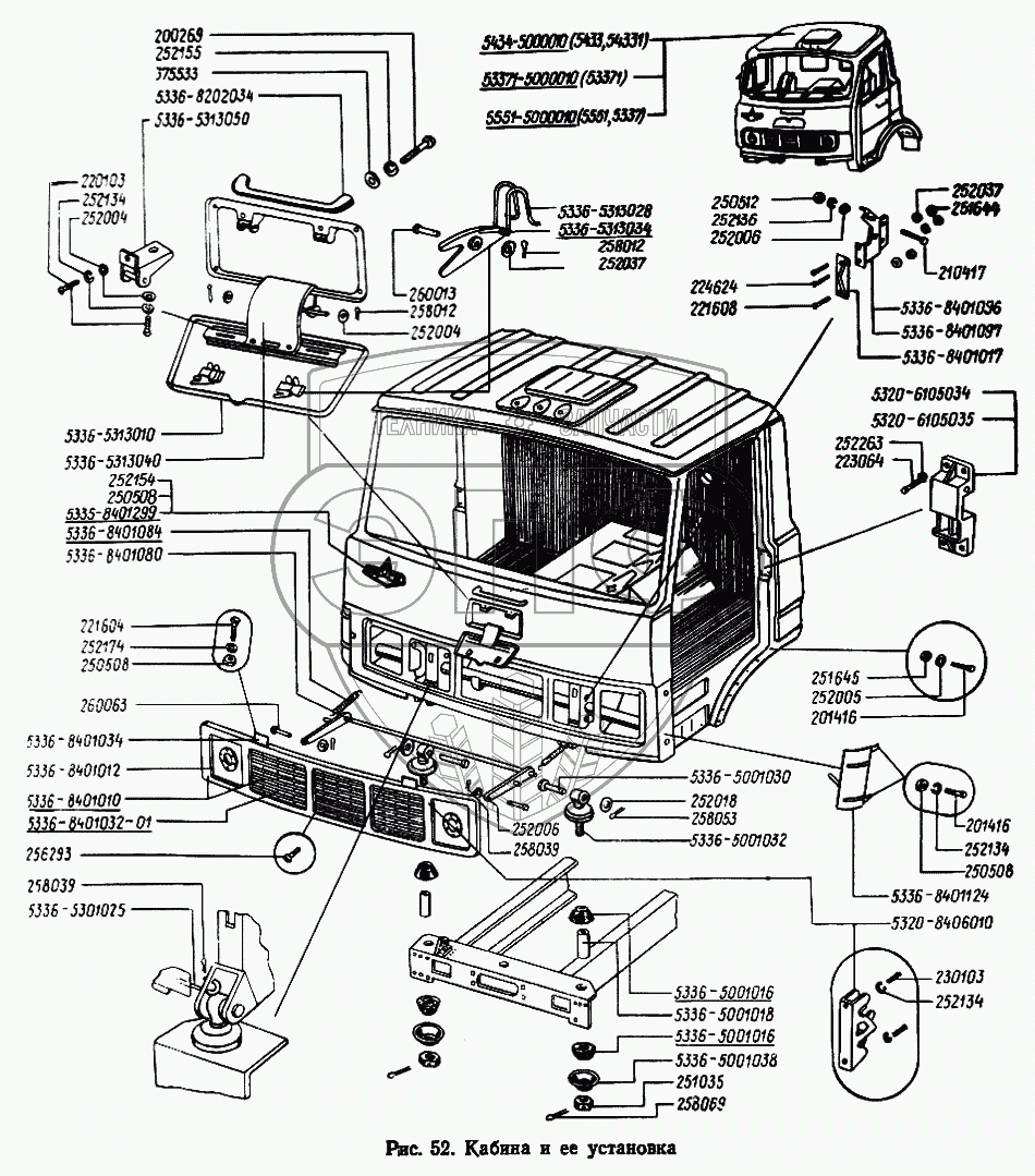 Каталог запасных частей к технике: МАЗ-5433. Кабина и ее установка