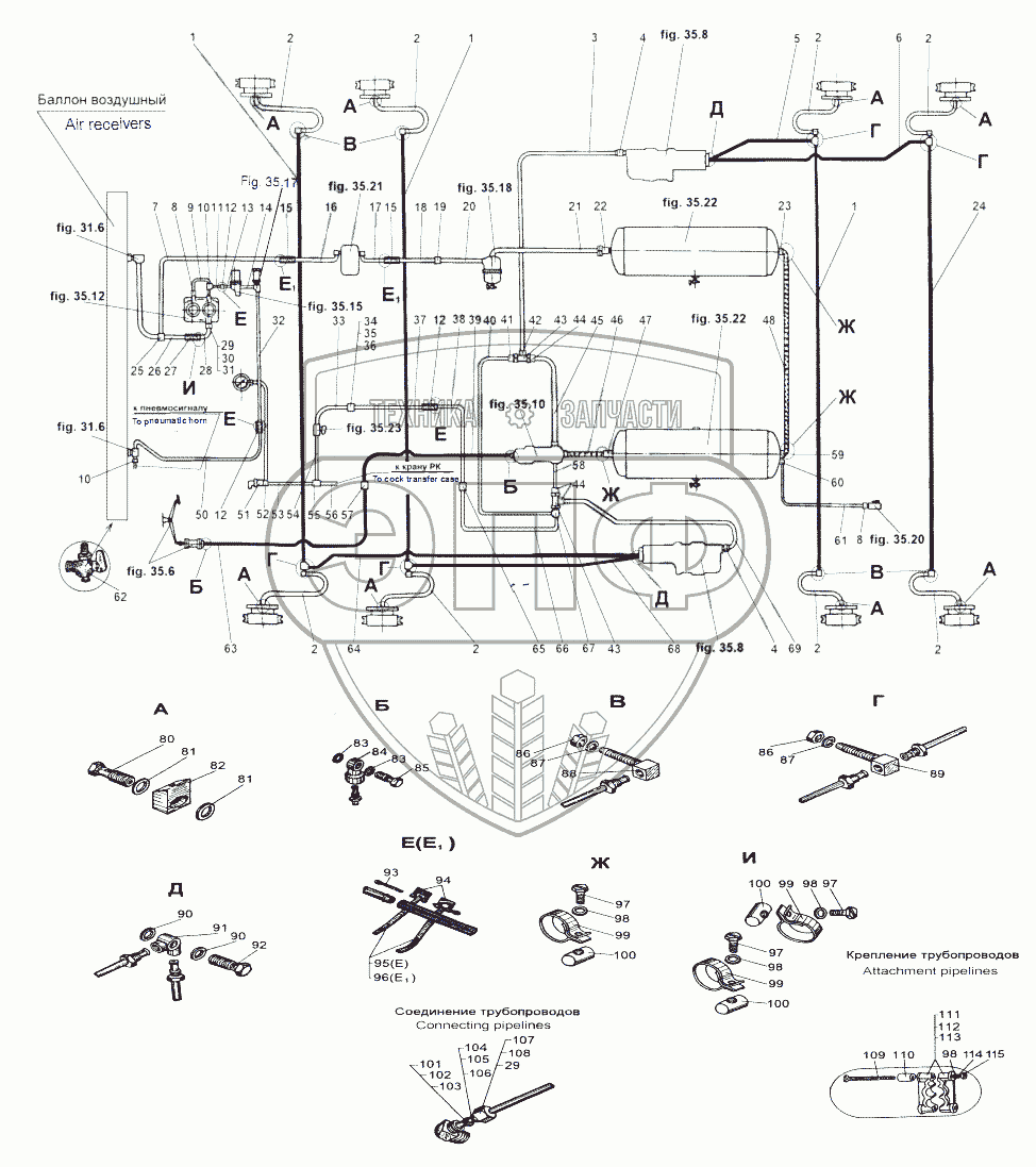 Каталог запасных частей к технике: МАЗ-543 (7310). Установка трубопроводов 543, 543А