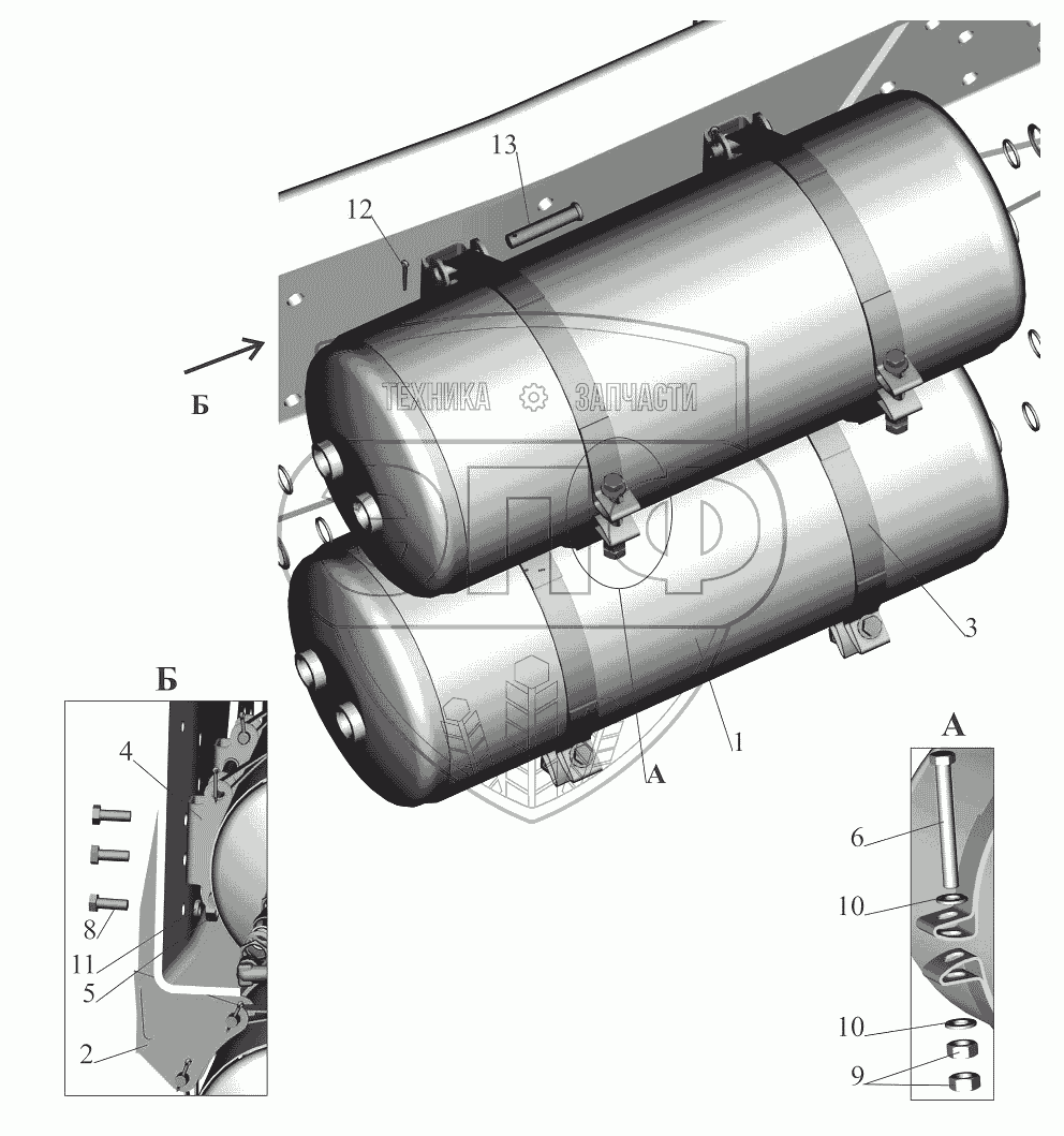 Каталог запасных частей к технике: МАЗ-5440B9, 6430B9. Крепление ресиверов 5440А9-3513006